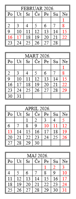 letnji semestar br> OD 2. februara do 29. maja 2026. Neradni dani